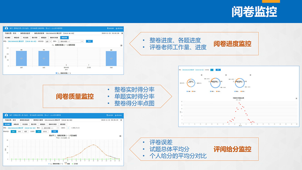 1. 閱卷進度監控: 顯示試題數、閱卷教師信息、全部和個人閱卷任務數、已閱份數、未閱份數、仲裁份數;顯示整卷進度、各題進度、評卷教師工作量及進度;